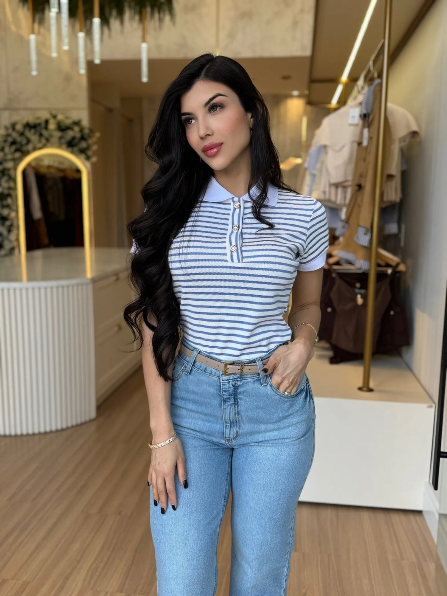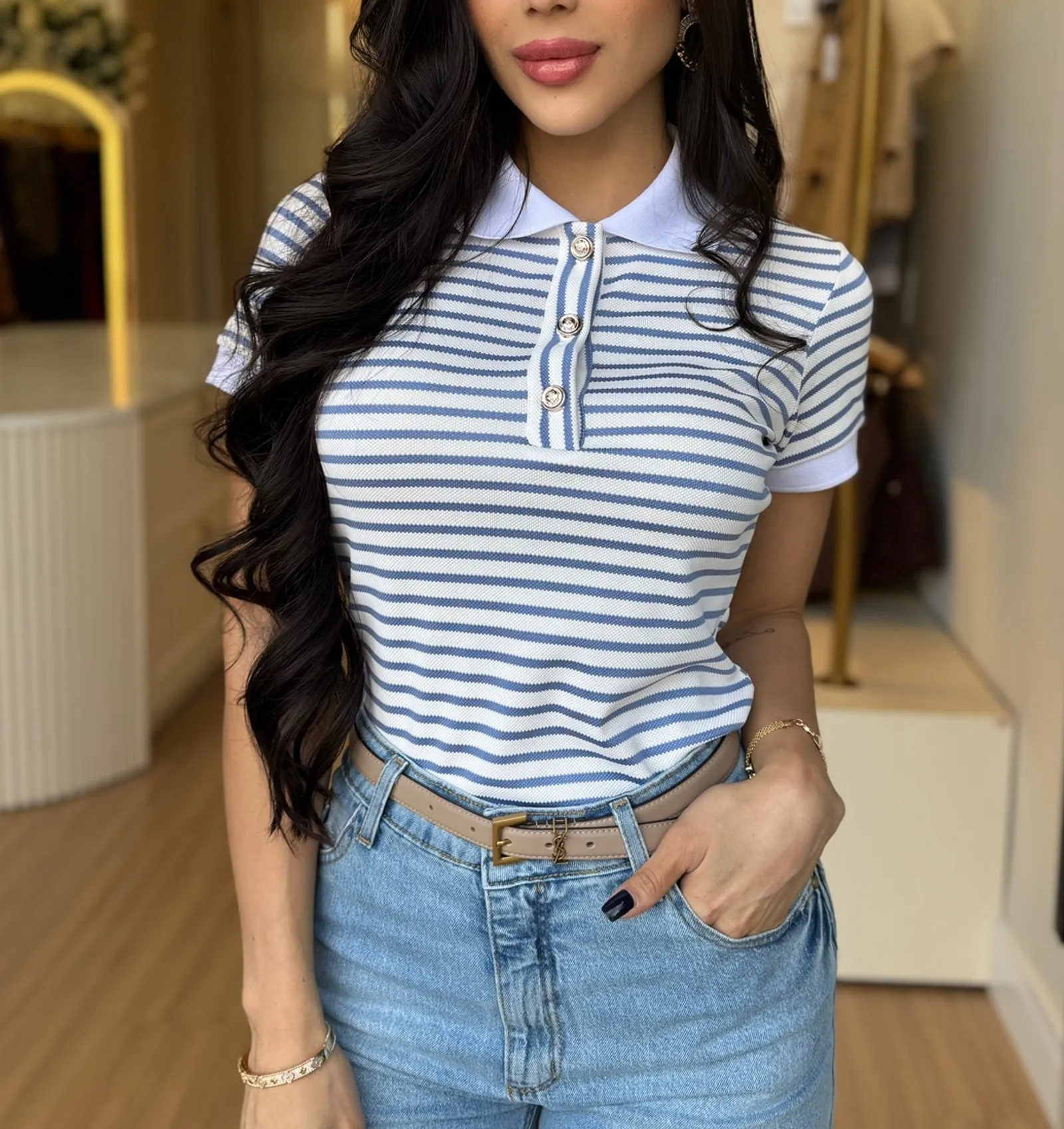 Blusa Rafa Elegância atemporal com um toque moderno. A Blusa Rafa é uma polo confeccionada em malha encorpada de alta qualidade, que garante caimento impecável e conforto ao vestir. O destaque fica por conta dos botões clássicos estilo Chanel e da gola branca estruturada com colarinho, que adicionam sofisticação à peça. Perfeita para produções casuais com charme ou composições mais refinadas para o dia a dia.