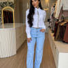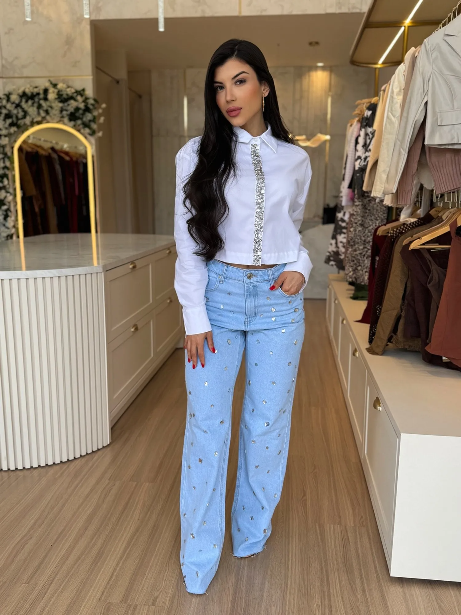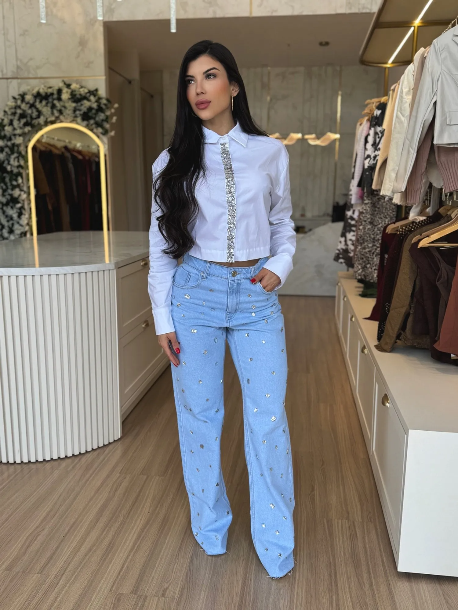 CALÇA WIDE LEG PEDRARIA JEANS CLARA