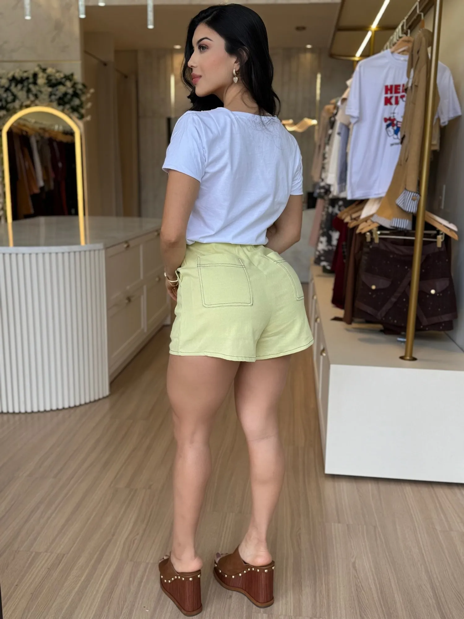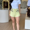 Shorts: com modelagem de cintura alta, apresenta bordados delicados na parte frontal, trazendo feminilidade ao look. Possui cordões com ponteira em metal, bolsos laterais e traseiros, pespontos em tom contrastante, que enriquecem os detalhes da peça, e fechamento posterior em zíper invisível, garantindo um caimento impecável e elegante.