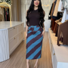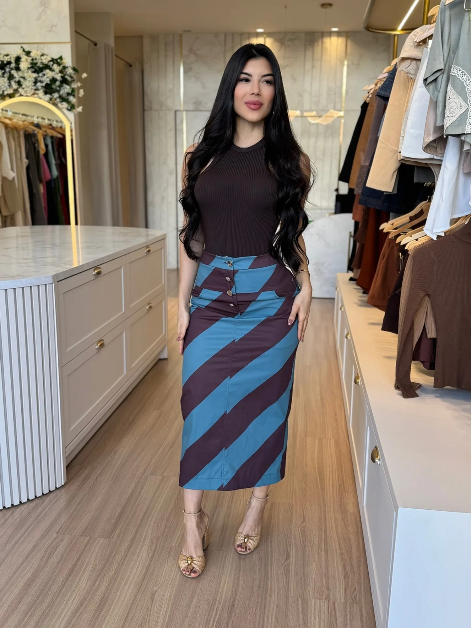 A saia é feita em sarja estruturada de alta qualidade, com listras diagonais em azul e vinho, trazendo modernidade e um visual super marcante. A modelagem é reta, com cintura alta, bolsos frontais  e fechamento em botões prata, além de fenda traseira que proporciona mais conforto ao caminhar.