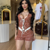 O Conjunto Layla é confeccionado em linho nobre bordado, composto por colete e shorts que unem sofisticação e charme artesanal. O colete é totalmente forrado, com detalhes em cordão trançado de algodão, barra com franjas no mesmo material, fechamento frontal com tassel e botão interno que garante segurança e caimento perfeito. O shorts, em modelo cintura alta, possui vista com ilhós trançados pelo mesmo cordão do colete e ponteiras em metal ouro envelhecido, acrescentando um toque refinado à peça.