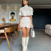 Conjunto de cropped e saia confeccionado em suede bege claro, com toque macio e encorpado, ideal para os dias de meia estação.