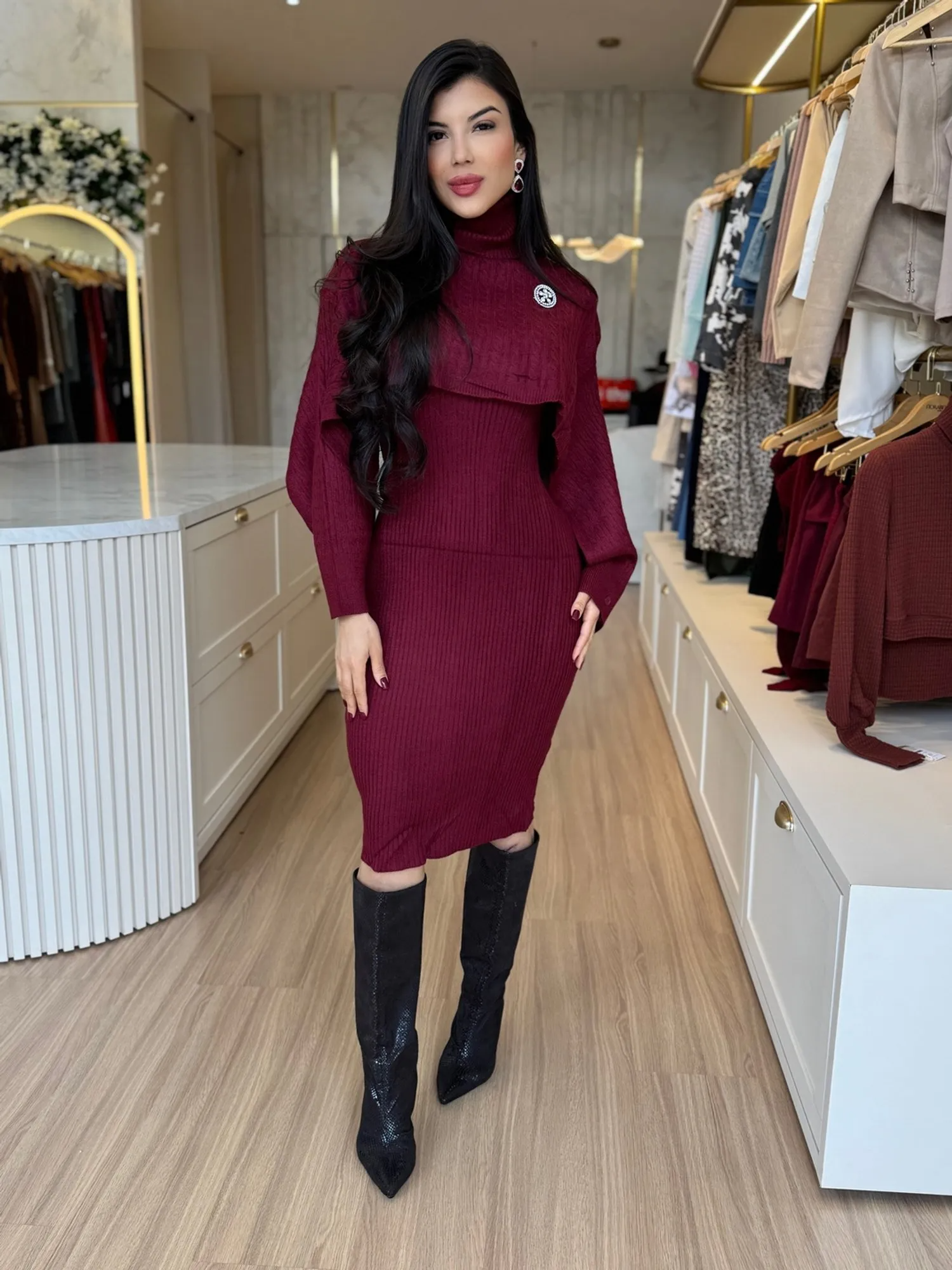 Vestido Marcela – Elegância e Versatilidade em Tricot Sofisticado e atemporal, o Vestido Marcela é confeccionado em tricot encorpado de alta qualidade, composto por 65% algodão e 35% poliéster, garantindo conforto, maciez e caimento impecável. O modelo possui shape ajustado ao corpo, valorizando a silhueta com elegância. Acompanha um bolero de mangas longas e amplas, que adiciona um toque de charme e modernidade à peça, podendo ser usado junto ou separadamente. A textura canelada e os detalhes em trança no bolero trazem sofisticação na medida certa.