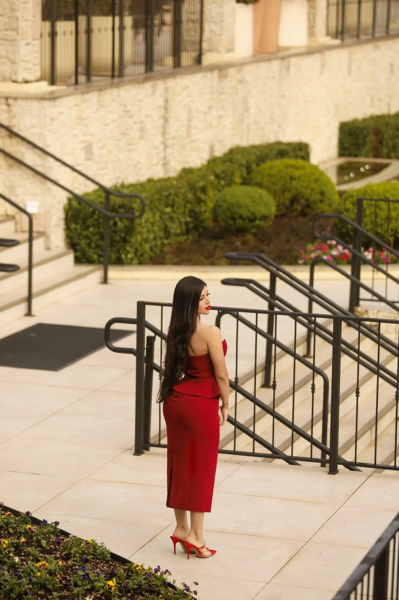 O Vestido Zoe é confeccionado em Alfaiataria, um tecido de gramatura encorpada e textura suave, com pouca elasticidade. A peça apresenta um caimento ajustado, valorizando o corpo de forma elegante. O modelo midi possui um decote tomara que caia e estrutura de barbatana para melhor sustentação, além de um delicado vazado no centro do busto. A parte superior conta com um detalhe peplum, enquanto a parte de trás traz uma fenda e um zíper de metal, garantindo sofisticação e praticidade.